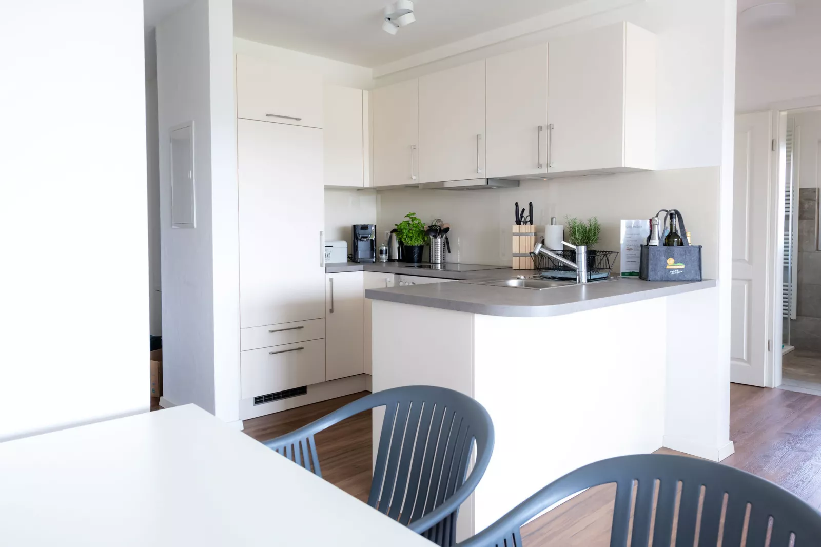 Küche mit offenem Wohn-/Essbereich, 2 Schlafzimmer, Bad