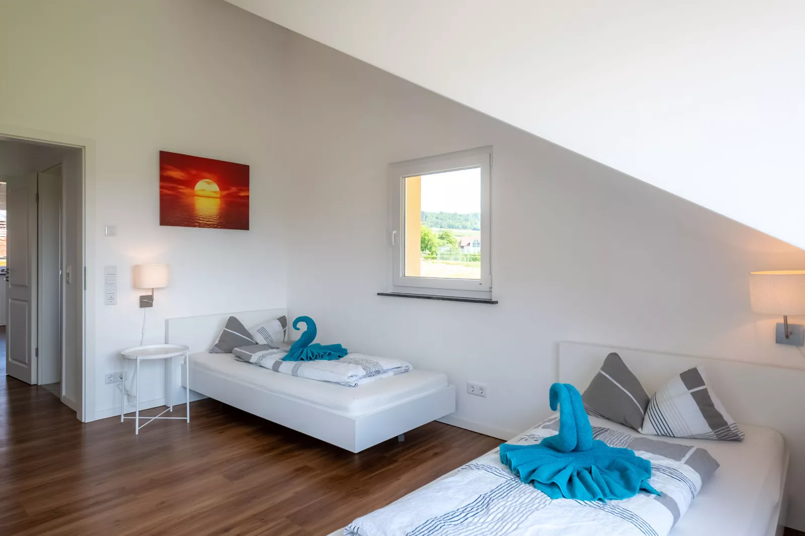 Doppelbett (160x200cm), zwei Einzelbetten (je 90x200cm), Schlafcouch im Wohnzimmer